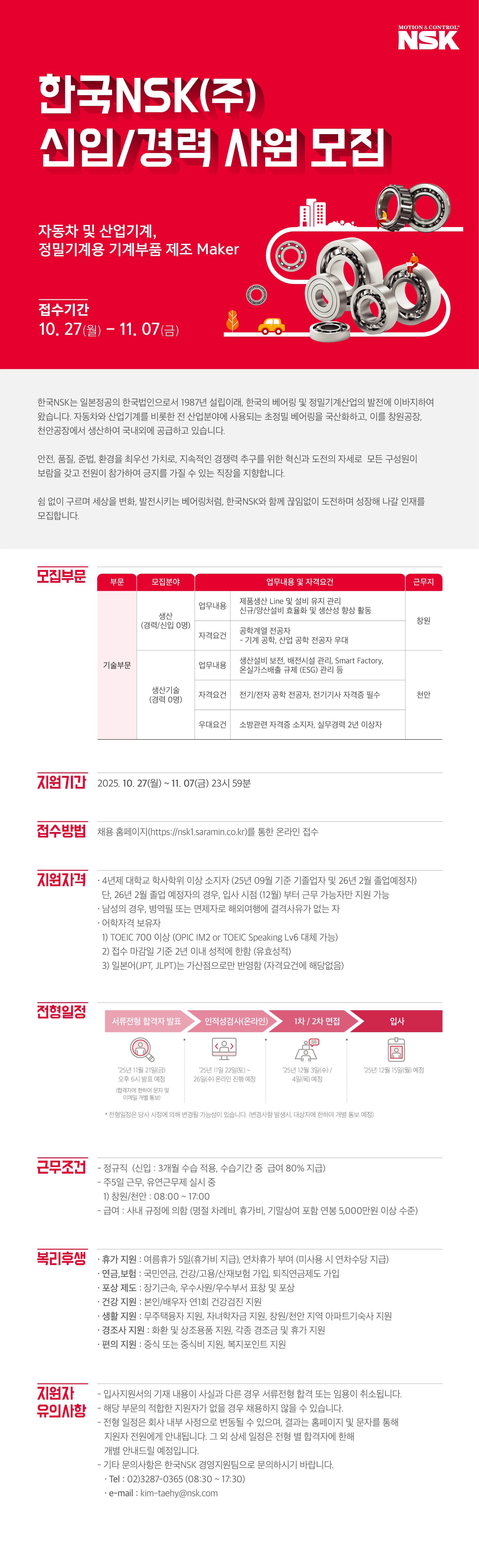 [한국NSK㈜] 신입/경력 사원 모집 (~11/07)